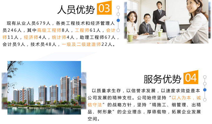 質量求生存,以信譽求發(fā)展,以速度求效益是本公司發(fā)展的精神支柱。公司始終堅持“以人為本,誠信守法”的戰(zhàn)略方針,堅持“精施工、細管理、出精品、樹形象”的企業理念,厚德載物,拓展企業發(fā)展空間。